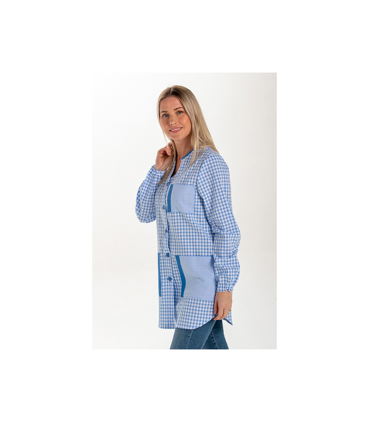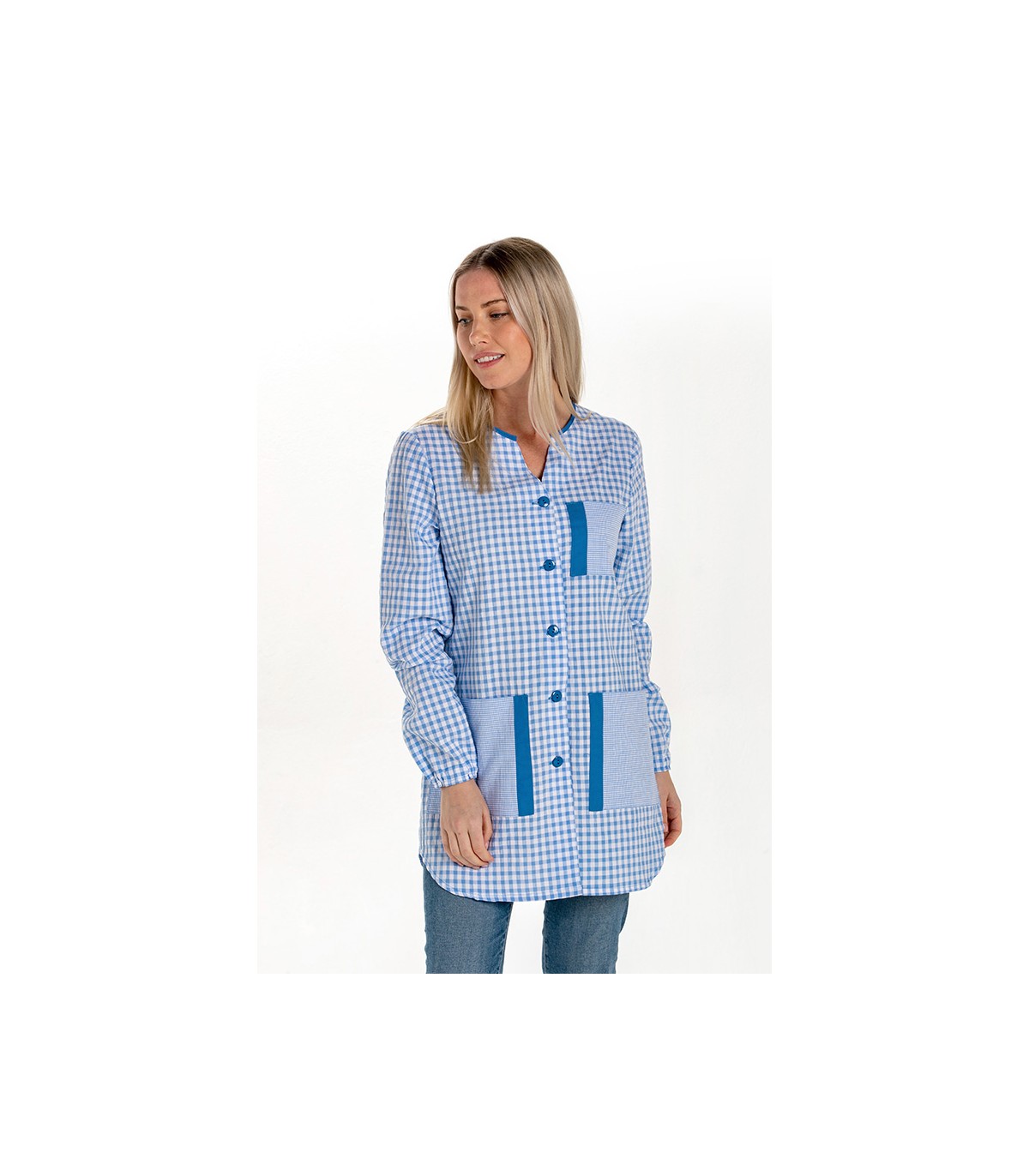 Bata para profesora corta de manga larga. Sin cuello. Detalle contraste en vivo cuello y tapetas bolsillos. Puños con goma. Combinación cuadro grande y pequeño. Abrochada central con botón. Con 3 bolsillos ,1 superior y 2 inferiores. Color celeste. Fabricado en tejido muy suave. Largo 84cm . Tallaje: SP - P- M- G- SG- SSG- XG.
