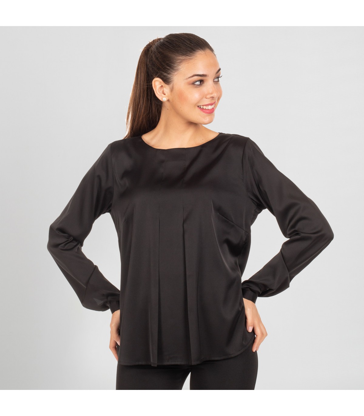 Blusa de mujer en manga larga, con cuello redondo y dos tablas en delantero a la altura del pecho. Modelo confeccionado en SATÉN de 94% Poliéster - 6 % Elastano. Cuenta con puños abotonados y pinzas en costados y espalda. Ideal para uniforme en hostelería y restauración, recepción, oficina o comercio. SATÉN 94% PES 6% EA - 100 gr/m².
