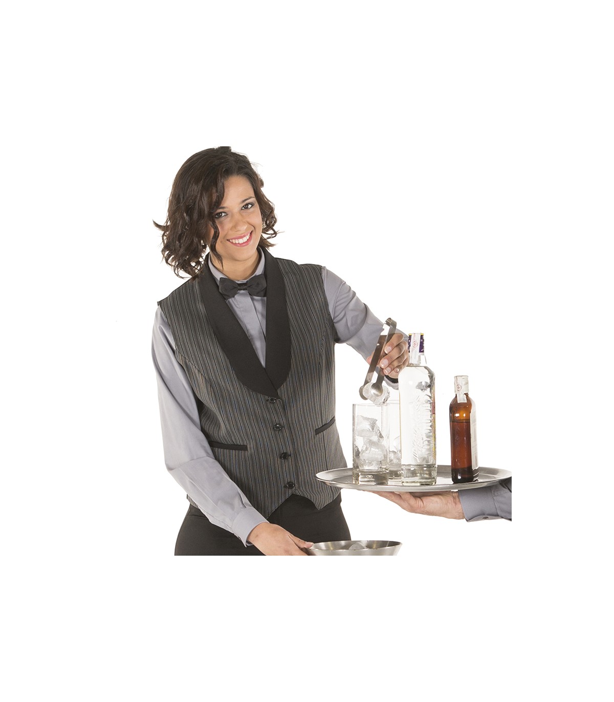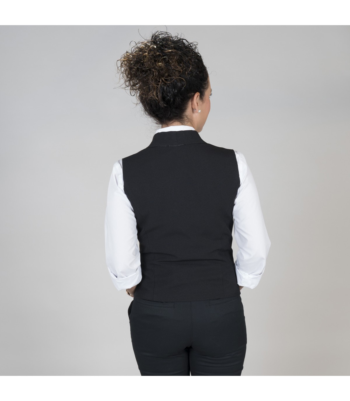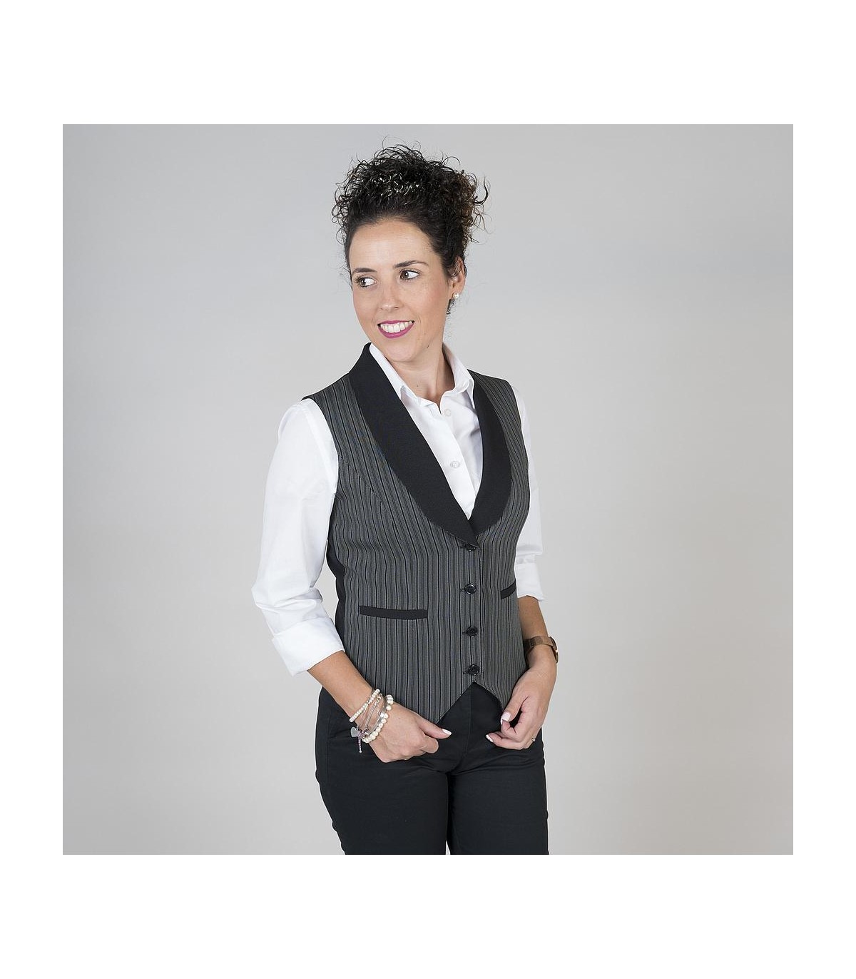 Chaleco para mujer con botones de pastilla vistos, cuello smoking y dos bolsillos de vivo. Modelo ajustado, con costadillos en delantero y trasero. Confeccionado en PLANA de 50% Poliéster - 50% Viscosa de rayas camperas grises, combinado en cuello y vivos en negro. Ideal para uniforme de camareras en hostelería y restauración. Disponible también modelo para hombre referencia 993100. PLANA 50% PES 50% VI - 200 gr/m².