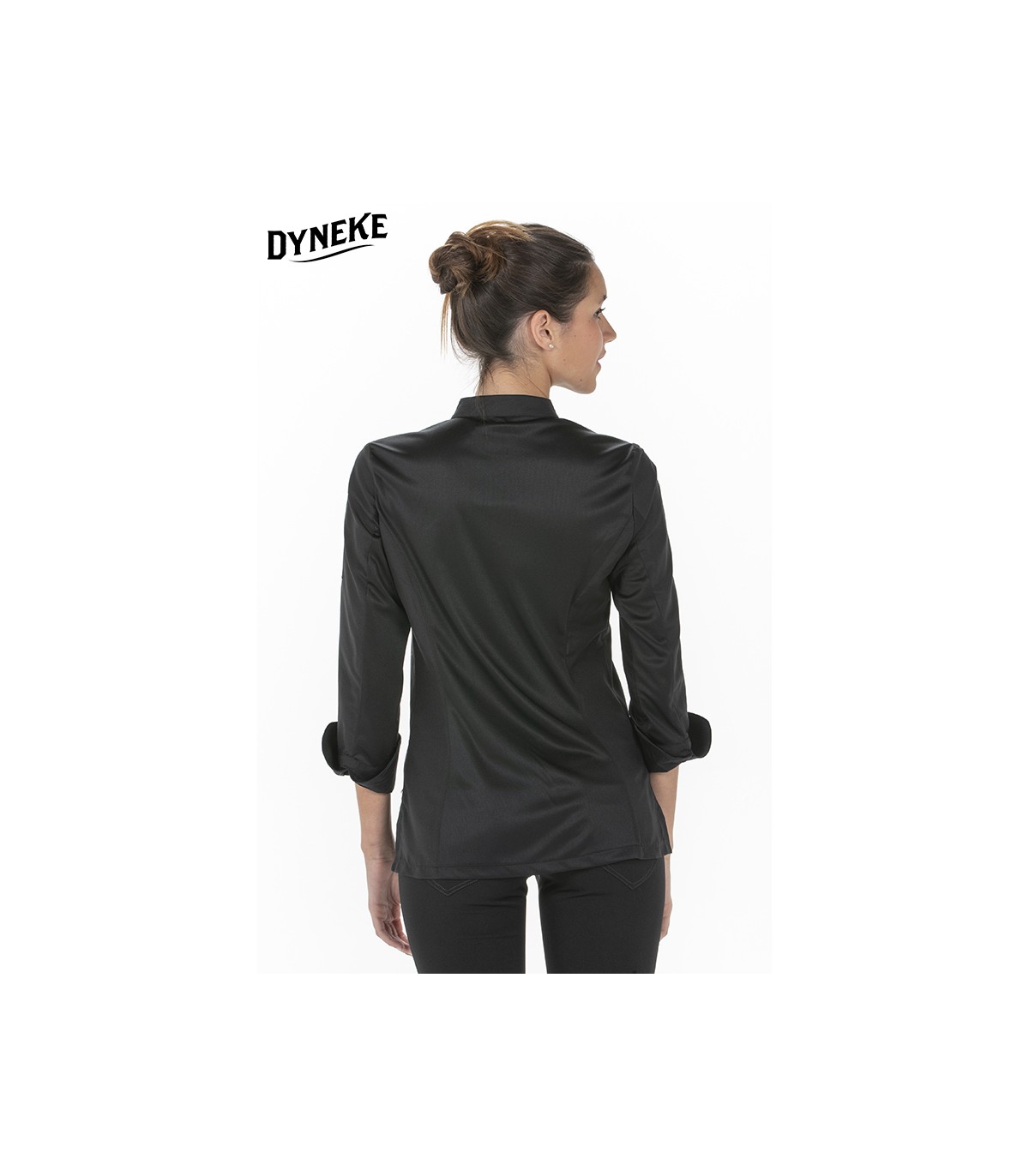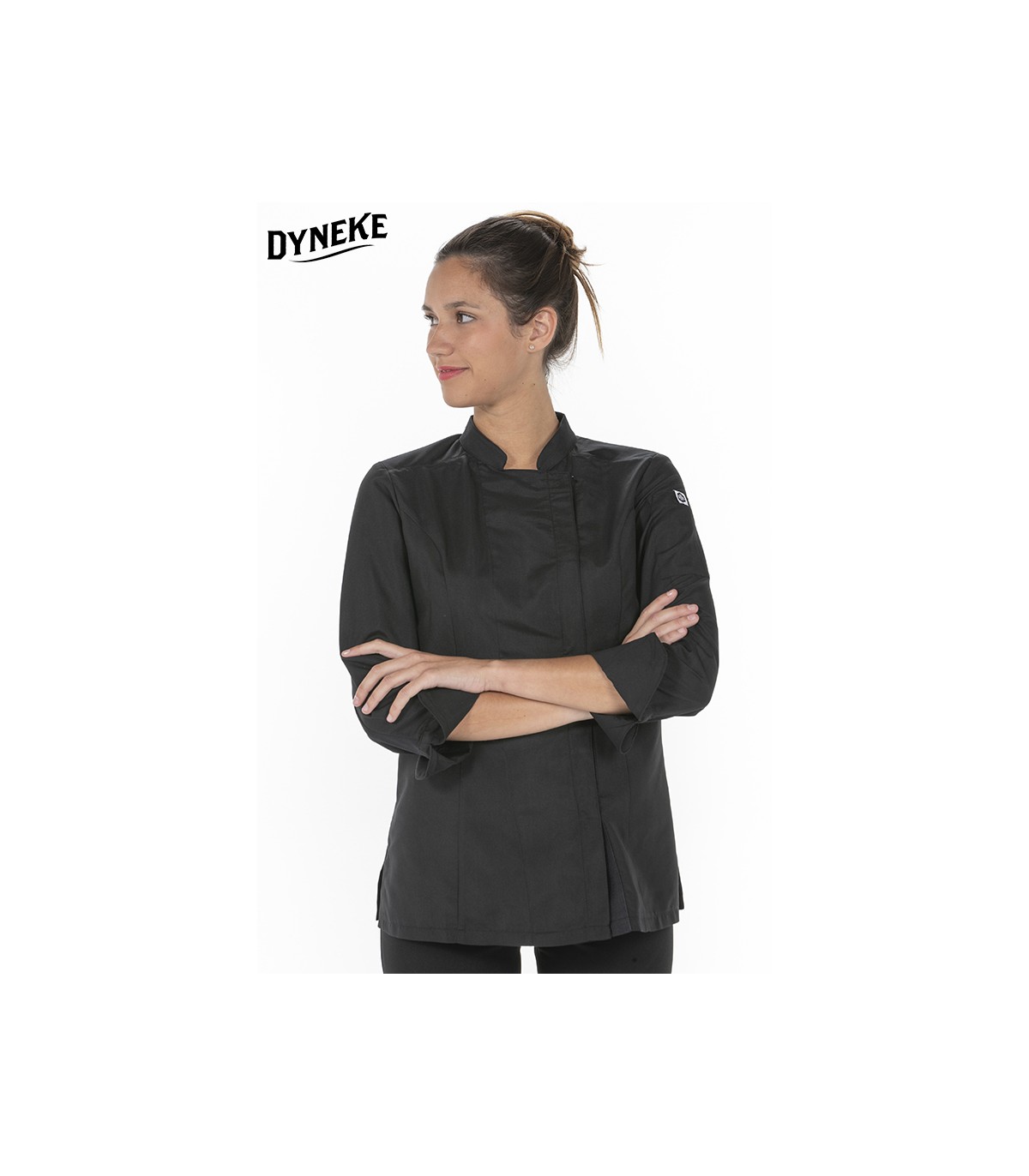 Chaqueta de cocinera en manga larga con puños vueltos. Abrochada con corchetes ocultos en tapeta cruzada. Tejido microfibra negra hidrofugada combinada con rejilla transpirable en espalda, hombros y interior de mangas. Bolsillo lateral en manga. Largo: 68 cm. Tallaje: SP - P - M - G - SG - SSG - XG.Propuestas: cocineros y restauración en general.