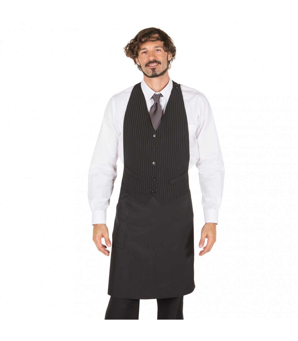 Delantal largo con peto imitando chaleco. Modelo confeccionado en 100% Poliéster, disponible en liso o raya diplomática. Cuenta con un bolsillo en delantero derecho y botones cosidos imitando el cierre del chaleco. Ideal para uniformes de camareros en bares y restaurantes, chefs o comercio. SARGA 100% PES - 220 gr/m².